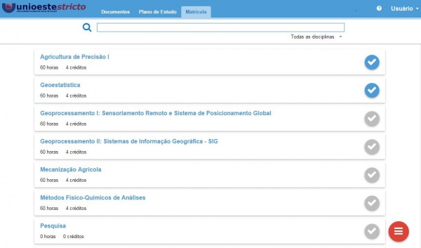 São selecionadas atividades que o aluno cursará no Programa de Pós-Graduação. Para finalizar, o usuário deve clicar no botão “Concluir” .