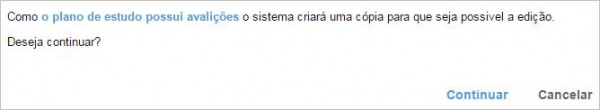 Ao clicar no botão “Editar” da Figura 8, o sistema analisa se neste plano de estudos já foi avaliado pelo Orientador ou Coordenação, caso afirmativo, o sistema notificará o usuário (Figura 10) sobre a necessidade de criar uma cópia do plano de estudos para que seja possível a edição, criando assim um versionamento, ou seja, um histórico de alterações de plano de estudos.