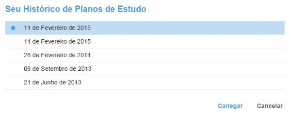 Ao clicar no botão “Carregar outra versão” na Figura 8 ou Figura 9, o sistema abre a janela ilustrada na Figura 11, a qual disponibiliza ao usuário o histórico das últimas 5 versões de plano de estudo criada.
