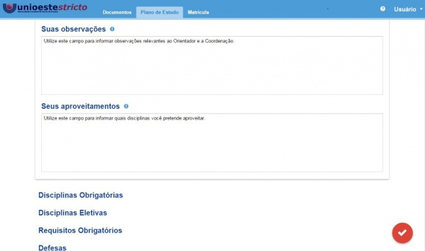 A Figura 5 representa a estrutura de plano de estudos criada. Ela é subdividia em tópicos, a saber: “Suas Observações” pode ser utilizado para informar algo relevante ao Orientador e Coordenação que não esteja informado nos tópicos seguintes.