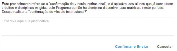 O botão “Solicitar confirmação de vínculo institucional” (Figura 13), é aplicável para alunos que não irão realizar matrícula em nenhuma atividade mas desejam continuar o curso na universidade.