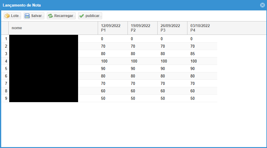 Tela para docente efetuar o lançamento das notas dos alunos por avaliação