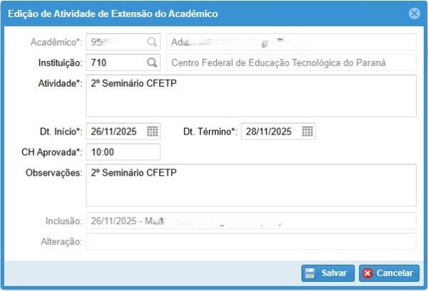 - participação do acadêmico na Atividade deve estar finalizada (Data de Saída) OU a Atividade deve estar concluída (Data de Término)