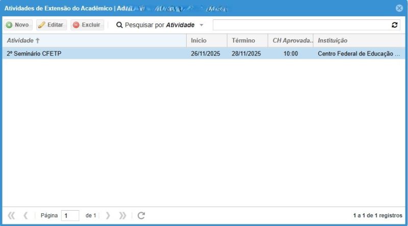 - Clique no botão Editar do acadêmico desejado para gerenciar as atividades de extensão provenientes do SGPj