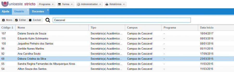 Para fazer uma busca de Secretário Acadêmico por Campus, digite o Nome do Campus que deseja, serão listados todos os Secretários do respectivo Campus.