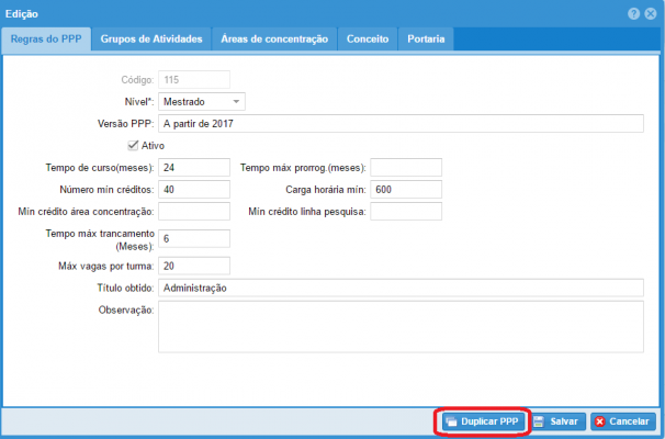 - Informações quantitativas. Tempo de curso e prorrogação é usado no cálculo de tempo máximo de curso de cada aluno, se passar o prazo a matrícula do aluno torna-se vencida. Mínimo de créditos e carga horária, caso aluno não atinja irá constar no histórico. Máximo vagas por turma é usado para criação da turma, o programa não pode criar uma turma com número de vagas maior.