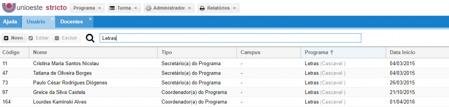 Neste caso, serão listados os nomes dos SECRETÁRIOS e COORDENADORES do PROGRAMA.