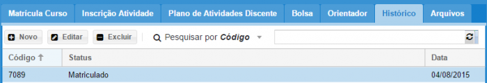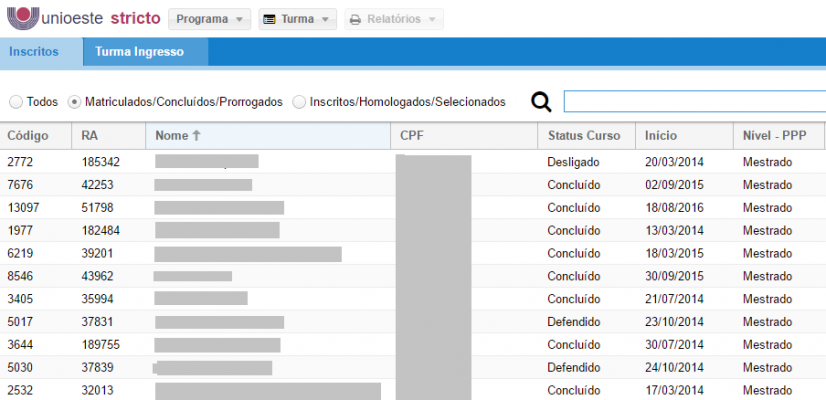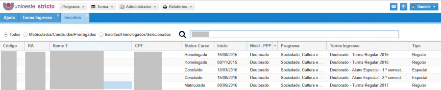 Acesse: Inscritos-> Selecione a Caixa: "Matriculados/Concluídos/Prorrogados" Selecione o Aluno que deseja visualizar. (Figura 1).