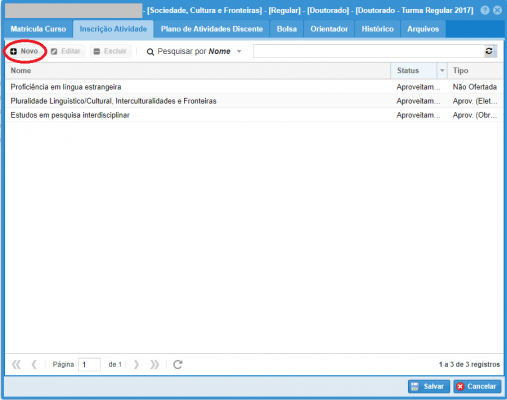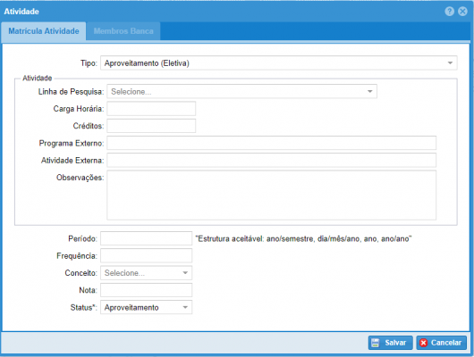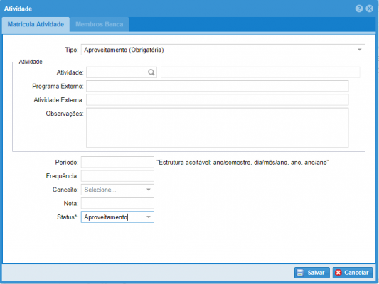 Em Matrícula Atividade, Selecione o Tipo de Aproveitamento.