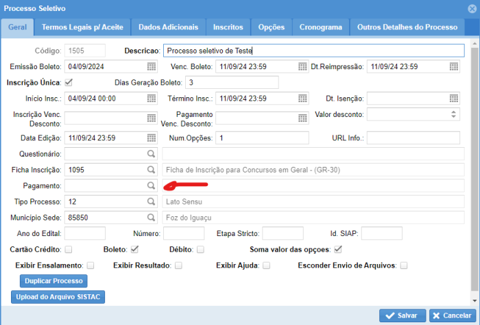 Após isso, a sua configuração de pagamento estará pronta para ser usada no processo seletivo. Para isso, acesse a aba "Principal". Selecione o processo seletivo e preencha o campo "Pagamento" com a configuração de pagamento recém criada: