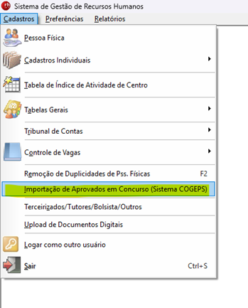 2.1) Acessar o SGRH e clicar no item de menu Importação de Aprovados em Concurso (Sistema COGEPS):