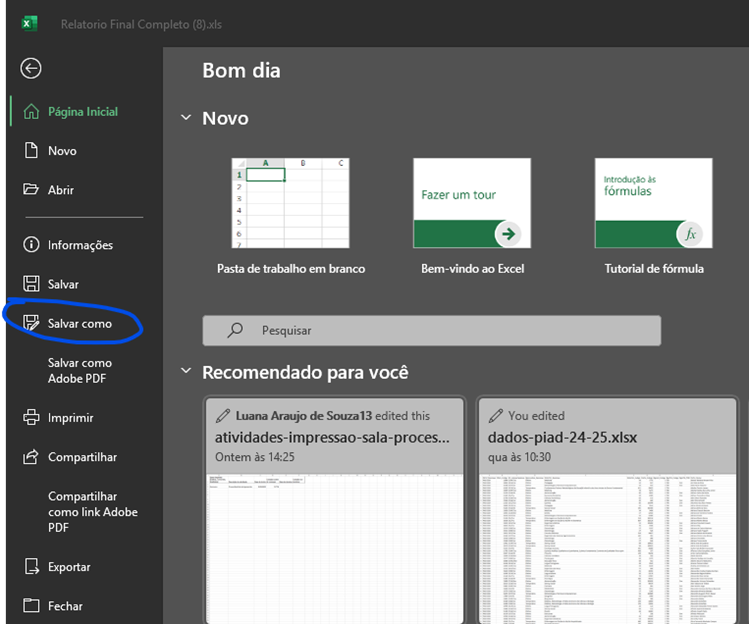 1.10) Ainda no Excel, clique sobre o botão Salvar como: