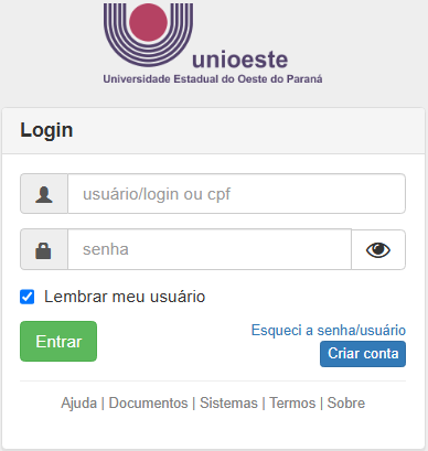 - Ter uma Conta/Login da Unioeste. Pessoas vinculadas à Unioeste tem seu usuário/conta/login criado automaticamente; Outros usuários podem criar uma conta (veja acima)