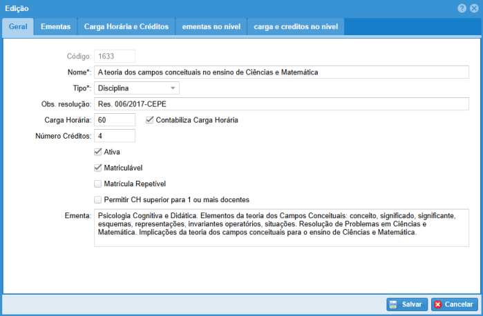 Para criar uma nova disciplina clique no botão Novo, caso queira editar ou visualizar alguma disciplina basta selecioná-la com duplo clique, quando o fizer aparecerá a janela de edição da atividade. Apenas usuários que tiverem liberação poderão criar novas disciplinas, editar ou excluir disciplinas existentes e acessar as abas Ementas, Carga Horária e Créditos, Ementas no Nível, Carga e Créditos no Nível da janela de edição. O padrão de acesso Coordenador não tem permissão para visualizar as abas citadas, tampouco tem permissão para inclusões, edições ou exclusões de atividades, portanto sua visualização é limitada às informações contidas na aba Geral da janela de edições onde poderá ver as informações daquela atividade. | |||