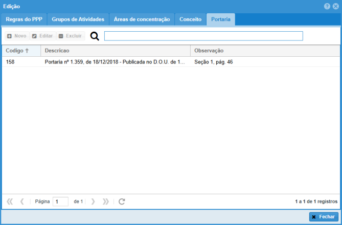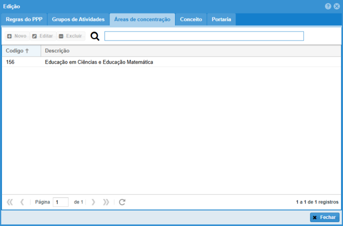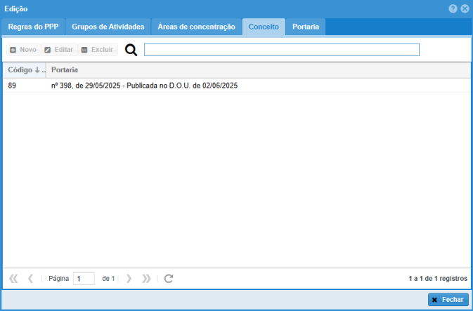Nessa aba o usuário visualizará a lista de Conceito do Programa. Nessa lista aparecem as seguintes colunas: Código do Conceito e Portaria do Conceito. | |||
