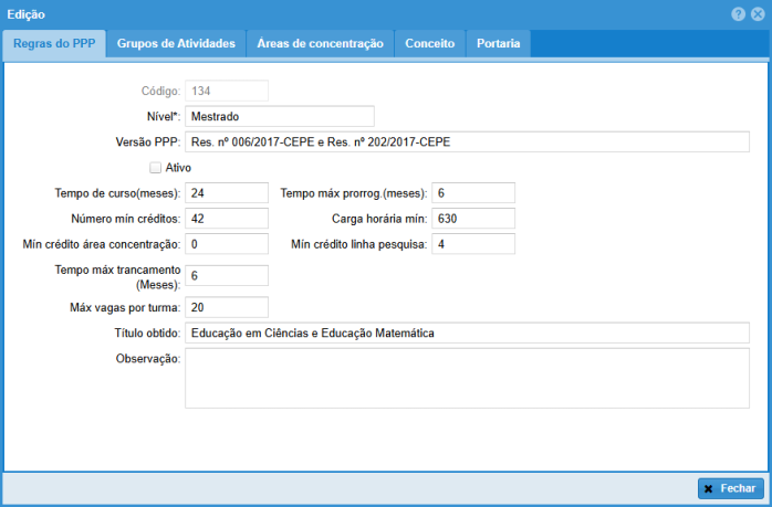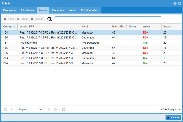 Nessa aba aparece a lista de Níveis por Versão do PPP que aquele Programa tem, podendo ser ativos ou não. Nessa lista aparecem as seguintes colunas: Código do Nível, Versão do PPP, Nível, Número Mínimo de Créditos, Ativo (situação de vigência do Nível) e Vagas. | |||