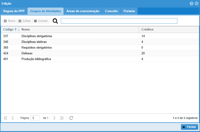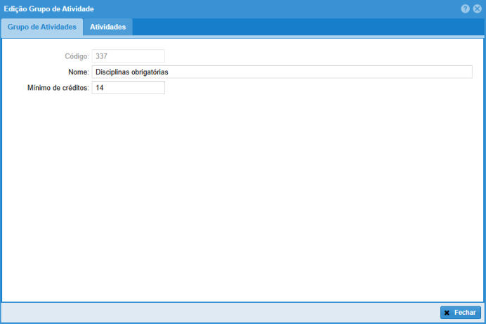 Nessa aba o usuário visualizará a lista de grupos de atividades. Nessa lista aparecem as seguintes colunas: Código do Grupo de Atividades, Nome do Grupo de Atividades e Créditos (Mínimos a serem cumpridos naquele grupo de atividades). | |||