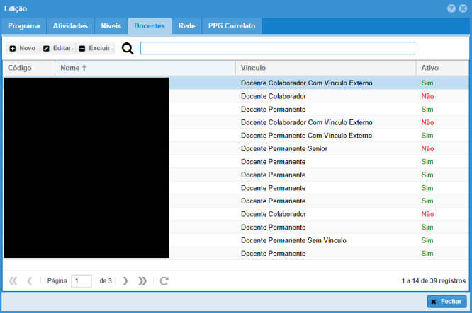 Nessa aba aparece a lista de Docentes do Programa, podendo ser ativos ou não. Nessa lista aparecem as seguintes colunas: Código do Docente, Nome do Docente, Vínculo do Docente e Ativo (situação do Vínculo do Docente com o Programa). | |||