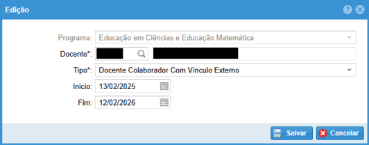 Para selecionar o novo Docente, clique na Lupa no campo: Docente.