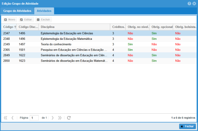 Na aba Atividades aparecem colunas com informações da atividade incluída naquele grupo, vale ressaltar as colunas Obrig. no nível, Obrig. opcional e Obrig. bolsista que indicam a obrigatoriedade de cursar aquela disciplina para o aluno que preencha as condições. | |||