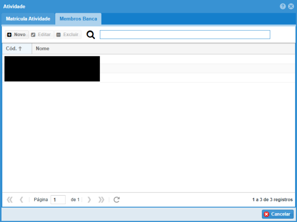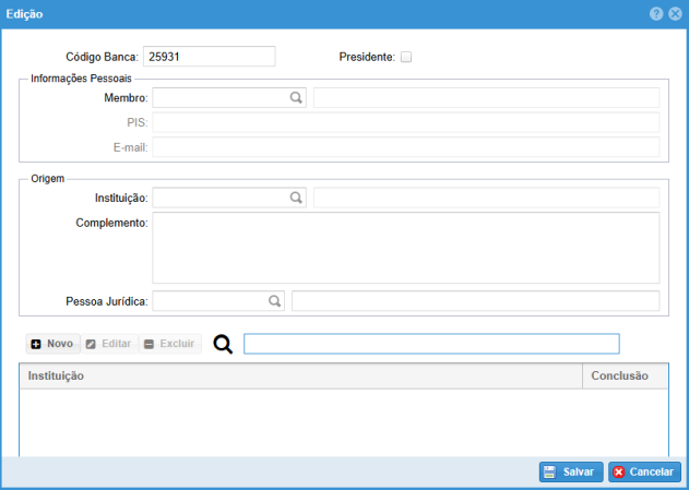 Para adicionar os membros, clique no botão Novo. Será aberta uma janela de edição (imagem à direita), onde deverão ser preenchidas corretamente as informações solicitadas.