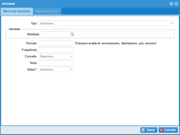 Caso a atividade adicionada seja um exame de qualificação ou uma defesa (tese ou dissertação), após salvar pela primeira vez será habilitada a aba Membros da Banca (imagem à esquerda). Nessa aba, o usuário poderá incluir os integrantes da banca examinadora/avaliadora responsáveis pela avaliação do exame ou defesa do aluno.
