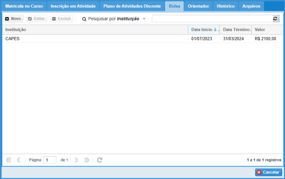 Essa aba traz a lista de Bolsas de estudo do aluno. Nessa lista aparecem as seguintes informações: Instituição financiadora da bolsa, Datas de Início e Término da Bolsa e o Valor da Bolsa.