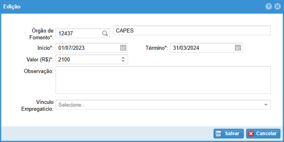 Para incluir ou editar uma bolsa de estudos, basta clicar no botão Novo ou selecionar a bolsa existente com duplo clique, ambas as ações abrirão a seguinte tela de edição onde o usuário poderá incluir as informações da bolsa.