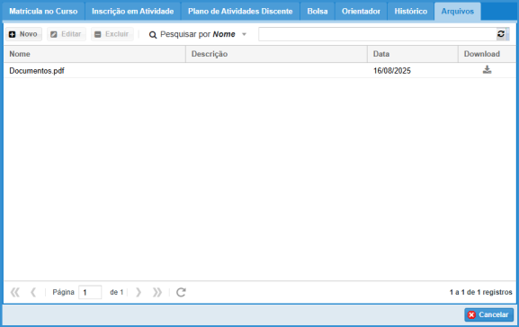 Essa aba traz a lista de Arquivos vinculados ao aluno que foram anexados no sistema. Nessa lista aparecem as seguintes informações: Nome do Arquivo, Descrição do Arquivo, Data de envio e Download (Coluna com botão onde é possível baixar o arquivo para visualização).