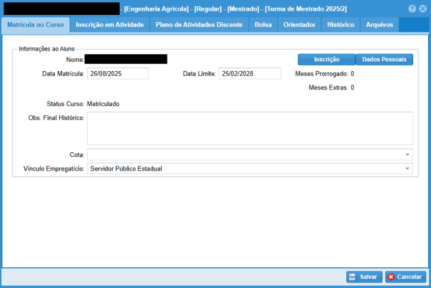 É a aba principal que abre automaticamente quando o usuário selecionar com duplo clique algum dos alunos da lista presente na Aba Matrículas no Curso da janela da turma ingresso, essa tela contém um resumo de informações do aluno. Nessa tela o usuário que tiver liberação poderá alterar as informações da matrícula do aluno, caso não tenha liberação não aparecerá o botão de salvar no rodapé da janela. Existem dois botões denominados Inscrição e Dados Pessoais nessa tela, caso o usuário clique em algum deles, abrirá duas janelas diferentes com informações adicionais de inscrição no processo seletivo e dados cadastrais do aluno.