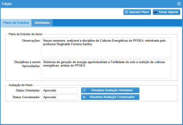Ao efetuar o duplo clique em algum dos planos, o usuário terá acesso ao conteúdo do plano de atividade do aluno. Essa informações estão dispostas em duas abas: Plano de Estudos e Atividades. A aba Plano de Estudos apresenta algumas observações e informações sobre aproveitamento. Além disso, possui 4 botões: um botão para impressão do plano, um botão para Tornar o plano Vigente, um botão para visualizar avaliação do Orientador e um botão para visualizar avaliação do Coordenador.