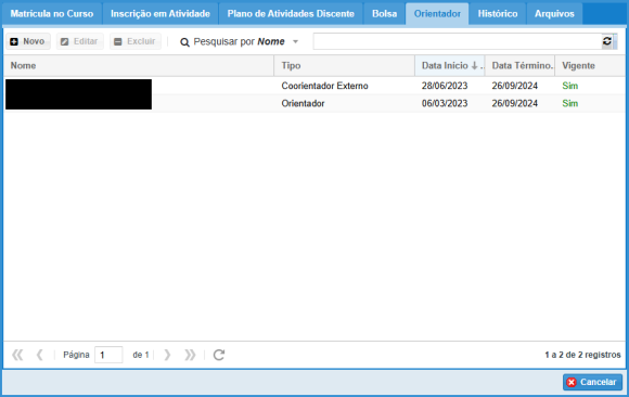 Essa aba traz a lista de Orientadores e Coorientadores do aluno. Nessa lista aparecem as seguintes informações: Nome do Orientador, Tipo (Orientador ou Coorientador), Datas de Início e Término da Orientação e a vigência da Orientação.