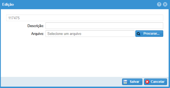 Para incluir um arquivo, basta clicar no botão Novo, assim abrirá a seguinte tela de edição onde o usuário poderá incluir os novos arquivos. Não recomendamos editar arquivos, pois é possível que o arquivo editado perca o anexo original adicionado e não consiga mais ser baixado para visualização.