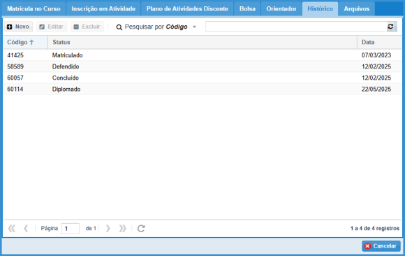 São apresentadas as seguintes informações: Código do Status, Status (Matriculado, Cancelado, Concluído, Defendido, Desligado, Diplomado, Promovido, Prorrogado, Suspenso, Trancado, Transferido e Vencido) e a data de inclusão de cada status.