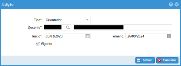 Para incluir ou editar um orientador/coorientador, basta clicar no botão Novo ou selecionar um pré-existente com duplo clique, ambas as ações abrirão a seguinte tela de edição onde o usuário poderá incluir as informações do orientador/coorientador.
