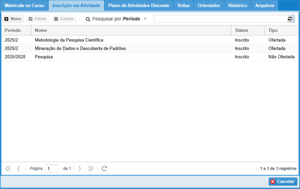 Essa aba apresenta a lista de atividades que o aluno está cursando ou já cursou, trazendo as seguintes informações: Período que a disciplina foi ministrada, nome da disciplina, o status do aluno na disciplina (aprovado, reprovado, inscrito) e o tipo da disciplina.