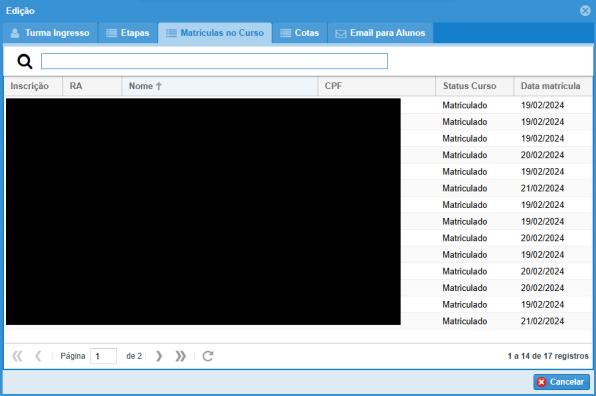 É a aba que contém a lista de estudantes matriculados naquela turma ingresso. Essa lista contém algumas informações sobre os alunos matriculados, são elas: Código da Inscrição, RA, Nome, CPF, Status do Curso e Data de Matrícula.