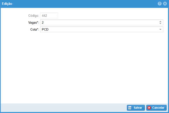 Caso o usuário queira adicionar uma cota para o processo seletivo da turma ingresso, basta clicar no botão Novo que abrirá a janela abaixo. Após incluir as informações na nova janela, basta salvar, fazendo isso a cota aparecerá na lista da aba Cotas.
