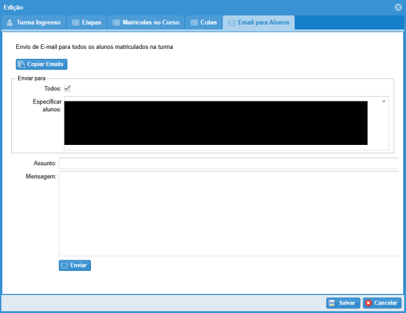 Essa aba permite o usuário criar e disparar e-mails para cada aluno da turma ingresso. Nessa janela aparecem os e-mails dos alunos que estão matriculados na turma ingresso, um campo para escrever o assunto e um campo para escrever a mensagem. Além disso existe um botão para copiar os endereços de e-mails dos alunos e um botão para enviar o e-mail escrito para os alunos.
