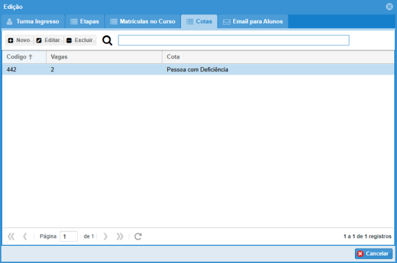 É a aba que contém a lista de tipos de cotas cadastradas para o processo seletivo daquela turma ingresso. Essa lista contém algumas informações sobre os tipos de cotas, são elas: Código da Cota, Nº de vagas, Tipo de Cota.