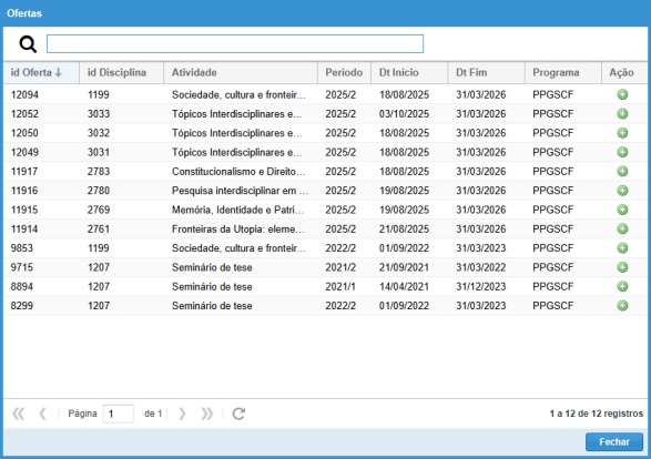 Ao clicar em "Oferta Disciplina" estarão listadas as Atividades ofertadas, constando o Período; Data de Início; Data de Término; Horário da Atividade e se ela está Aberta ou Fechada.