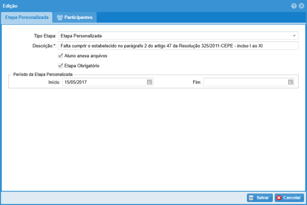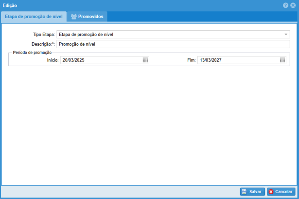 Abaixo segue o exemplo da janela de edição na aba de etapa de Promoção de Nível.