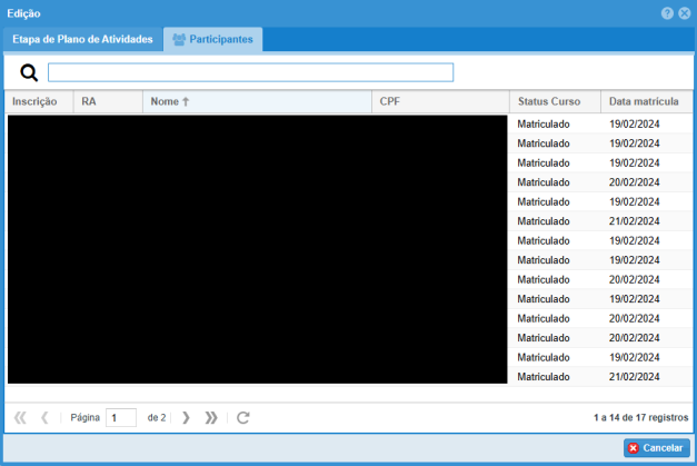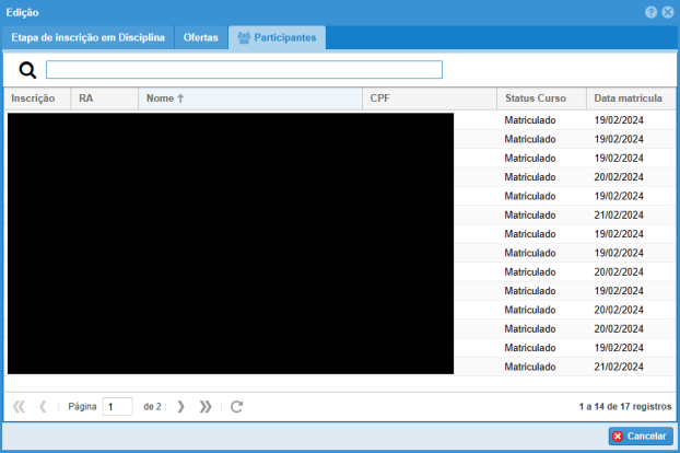 É a aba que contém a lista de estudantes matriculados naquela turma ingresso. Essa lista contém algumas informações sobre os alunos matriculados, são elas: Código da Inscrição, RA, Nome, CPF, Status do Curso e Data de Matrícula.