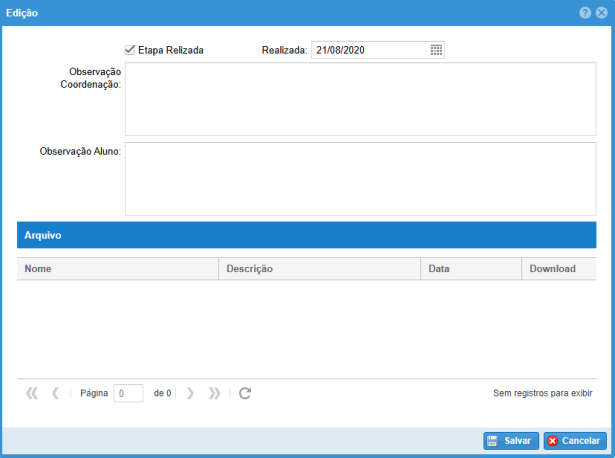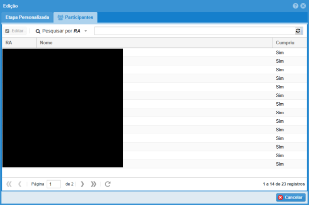 Caso efetue o duplo clique no nome do estudante, abrirá as informações do cumprimento da etapa pelo estudante selecionado.