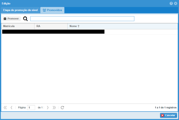 Abaixo segue o exemplo da aba de Promovidos na etapa de Promoção de Nível. Essa aba apresenta a lista de alunos promovidos nessa etapa.