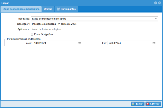 | Abaixo seguem os exemplos das janelas de edição na aba de etapas de inscrição de turmas regulares e especiais. Existem campos diferentes para cada tipo de turma. | |||