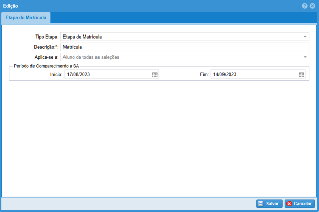 | Ao selecionar o tipo de etapa, os campos editáveis serão ajustados automaticamente conforme o tipo escolhido. | |||