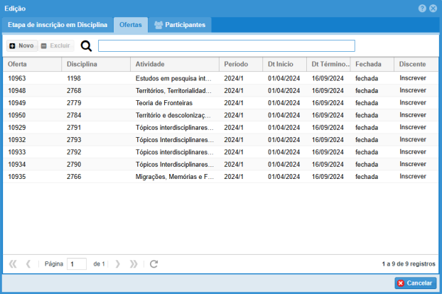 Para ofertar uma nova disciplina, clique no botão: +Novo.