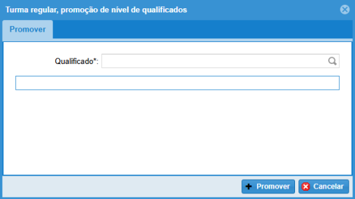 Caso o usuário clique no botão promover presente na aba Promovidos, abrirá a janela abaixo. Nessa janela o usuário poderá incluir o aluno qualificado para a promoção e então salvar, fazendo isso o aluno aparecerá na lista da aba Promovidos.