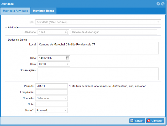 Após preenchida corretamente a Matrícula da Atividade, abra novamente e estará habilitado a aba "Membros da Banca".